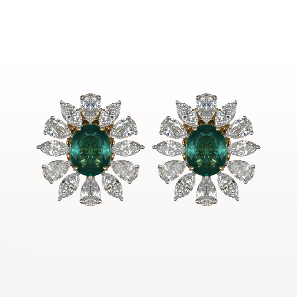 Radiating the freshness of nature and the elegance of fine craftsmanship, the Emerald Bloom Earrings are a true celebration of floral beauty. Set in 18KT yellow gold, these exquisite earrings feature a lush oval-shaped emerald at the heart, embraced by a delicate halo of pear and marquise-shaped diamonds that resemble petals in full bloom. The vibrant green center stone evokes the vitality of spring gardens, while the sparkling diamonds mirror the brilliance of morning dew on blossoms. Timeless yet modern, this design captures the grace of a green flower in eternal bloom, making it a perfect piece for women who embrace both natural beauty and refined luxury.